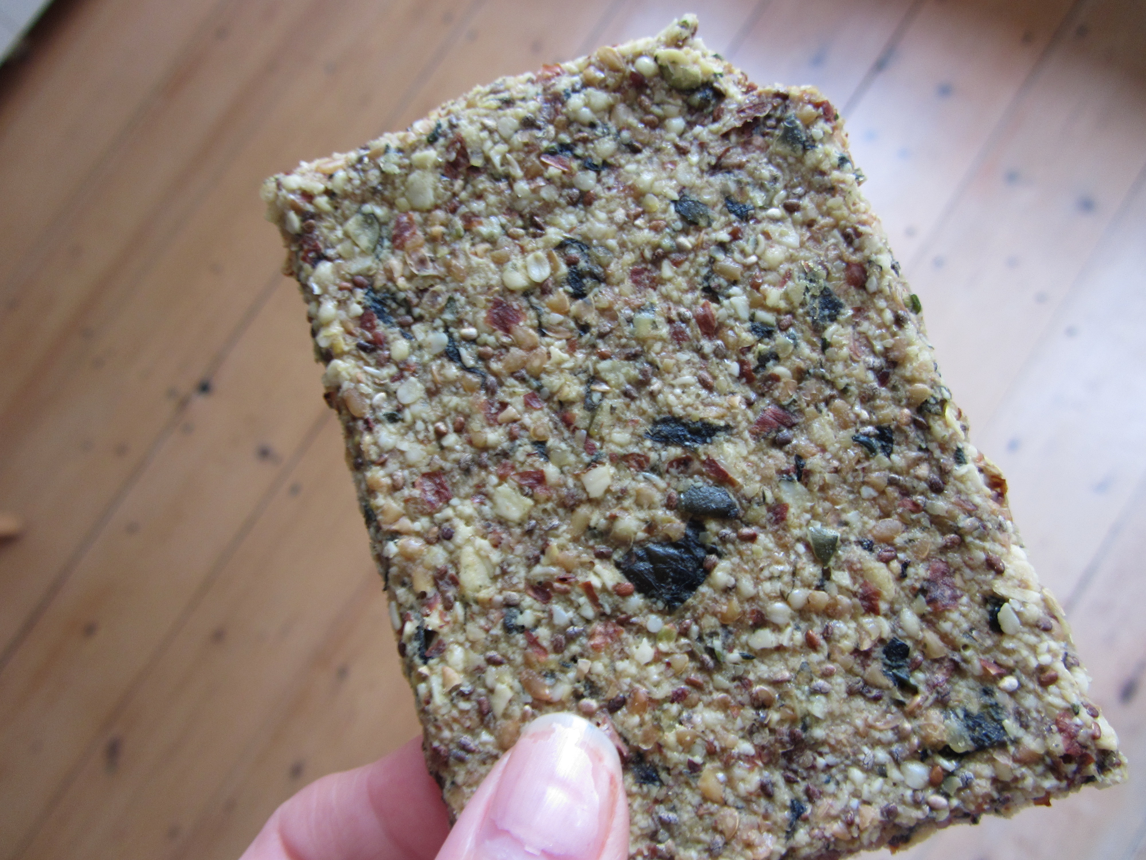 Bio Chia hennep brood: een rijke bron van omega 3 vetzuren omdat er zowel chia, hennep als lijnzaad in zit. Het word brood genoemd maar eigenlijk is het een hele rijke cracker. De crackers zijn ook lekker knapperig, je kunt er iets op smeren, of zoals ik wel eens doe, een cracker verkruimelen over de salade. De smaak is hartig maar neutraal, je kunt hem met zoete en hartige smaken combineren.